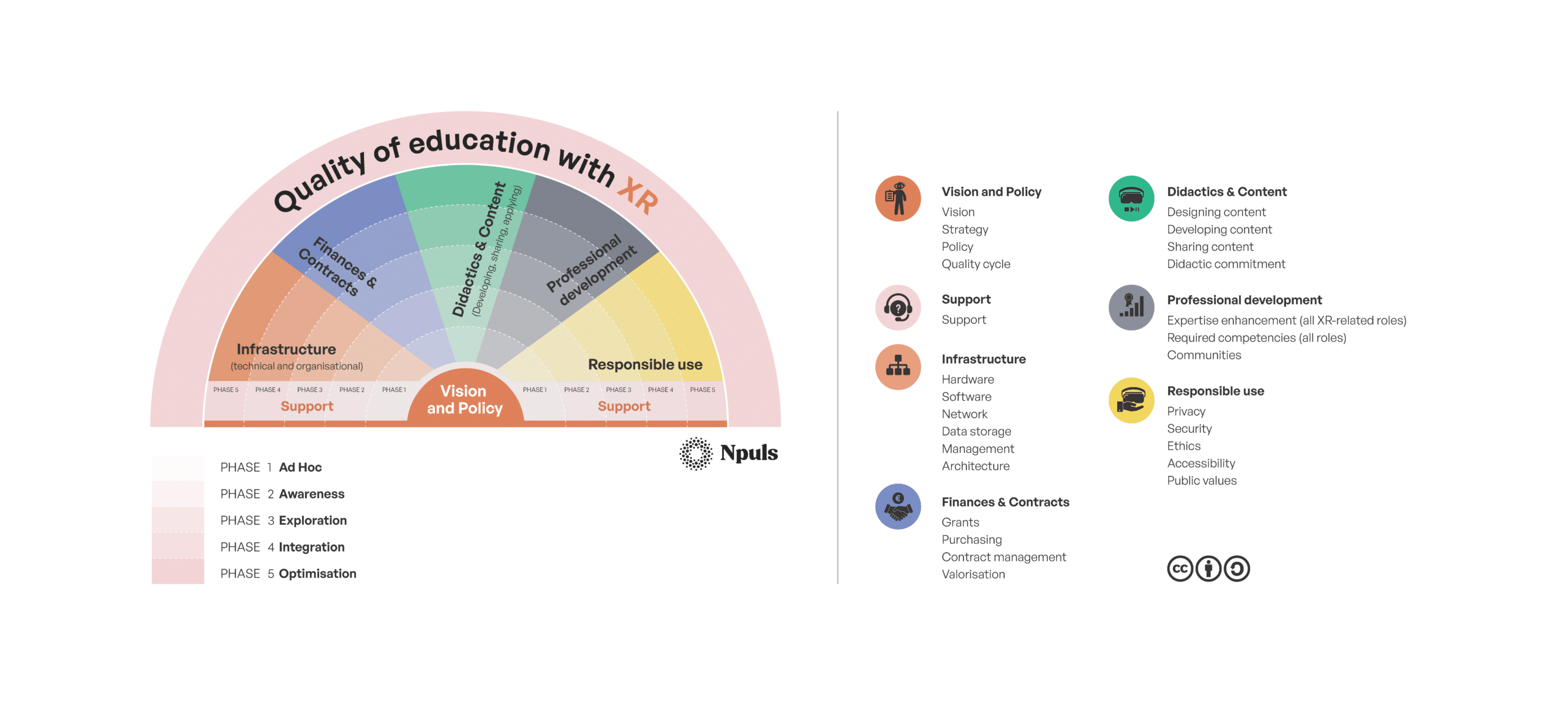 The XR Framework provides an overview of seven core themes that encompass all aspects needed to organise and facilitate XR implementation. These themes cover the entire adoption process, from policy development and infrastructure to support and practical application. The accompanying toolbox equips educational institutions with practical tools and strategies to support and streamline the effective introduction of XR.